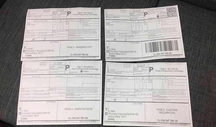 打印出来的 Label 一共两张,经过裁剪共四张面单,其中第四张 Sender’s Copy 自己留下,其余三张按顺序放在报关袋里贴在包裹上寄走。请注意只能留下Sender’s Copy,美国海关收到包裹后,如没有其他三张包裹将被退回。