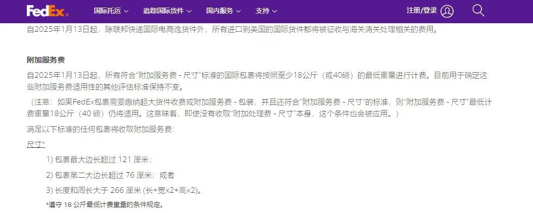 (注意:如果FedEx包裹需要缴纳超大货件收费或附加服务费-包装,并且还符合附加服务费-尺寸”的标准,则“附加服务费-尺寸”最低计