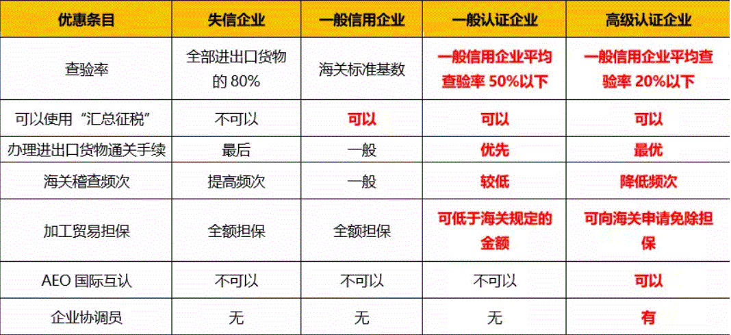 小D研究了海关的具体要求之后,总结了一下各级别企业在通关过程中可享受的优惠措施对比:
