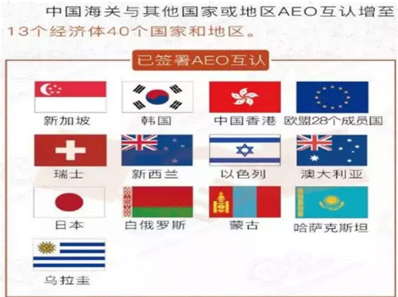 简而言之,AEO认证企业不仅在中国能享受较高的通关时效,在AEO互认国家也可以哦~~目前,与中国海关达成AEO互认的国家或地区已经达到了40个!