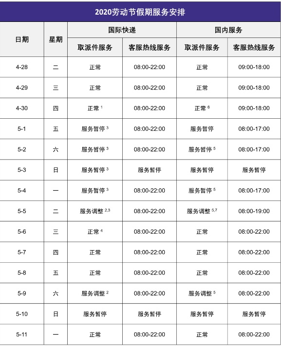 4. 5月6日国际快递当天午前送达服务取消,将在18:00前送达。