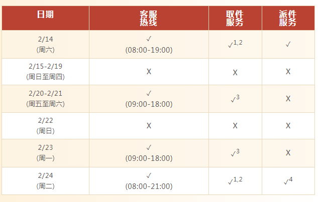 UPS国际快递2026年春节假期为2026年2月15日至2月23日,在以下时段,UPS的服务将会作临时调整,具体安排如下: