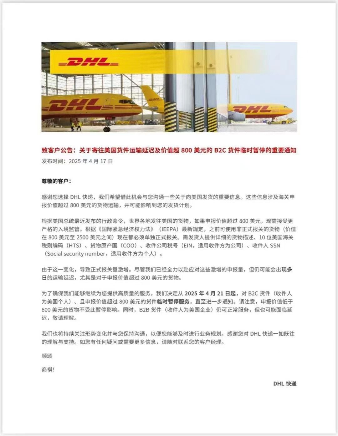 DHL国际快递暂停产品申报超800美金的货物至美国服务