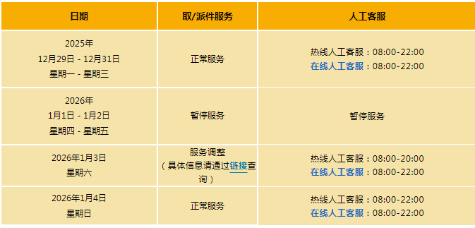 自2026年1月4日(星期日)起,取派件服务恢复正常。