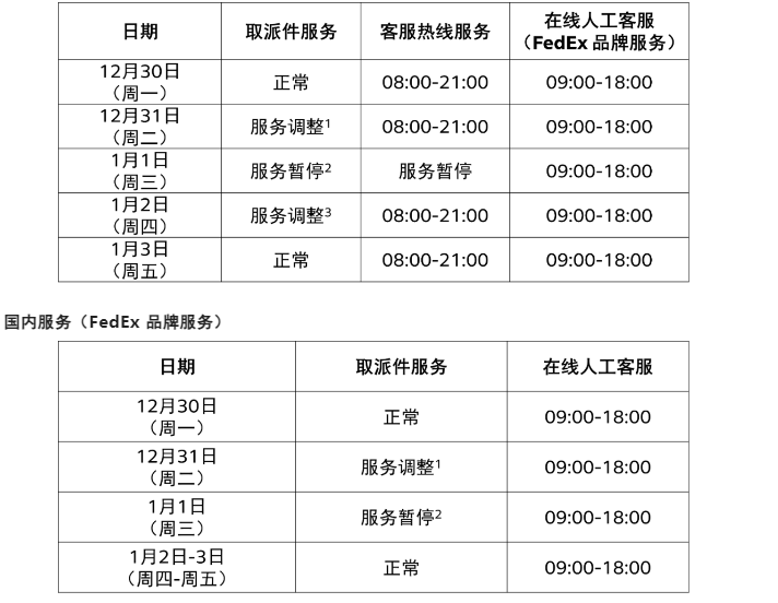 FedEx联邦国际快递-2025年元旦节假期服务安排