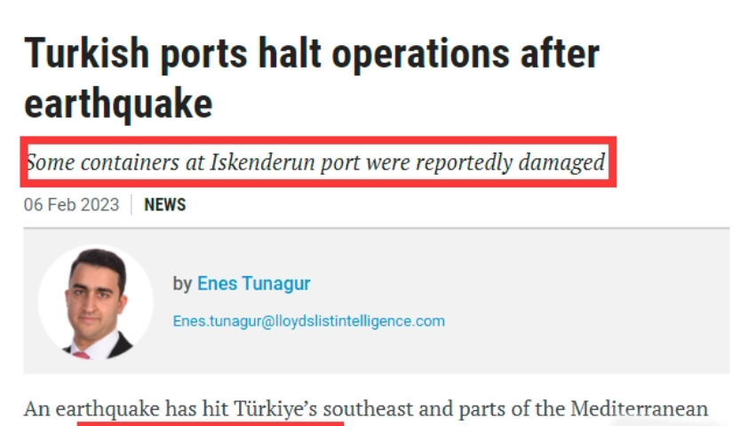 据国际知名航运媒体《劳氏日报》(Lloyd's List)报道,2月6日,地震袭击了土耳其东南部和部分地中海沿岸地区,造成港口运营中断,伊斯肯德伦港的大量集装箱倒塌遭到损坏。