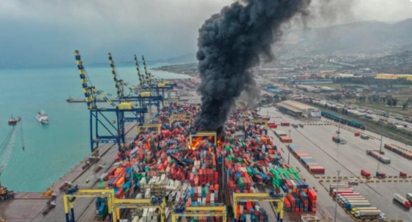 据路透社的目击者和录像显示,周一大地震过后,土耳其位于东地中海沿岸哈塔伊省南部的最大港口伊斯肯德伦港发生集装箱倒塌并引起严重火灾,一缕缕黑烟高高飘向空中。