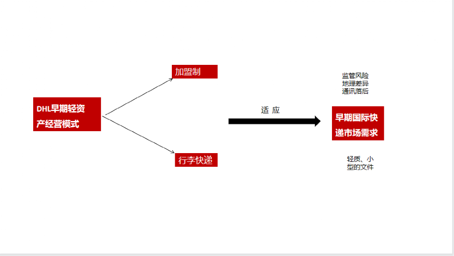 为了适应新的包裹运输需求,也为了提高竞争优势,DHL决定脱胎换骨,摆脱掉曾让其在70年代实现快速扩张的加盟制,转向直营。在组织架构上设立总部进行统一协调,并开始搭建运营网络,自购机队、租赁货舱、设立国际转运与分拨中心。至90年代末,DHL核心的国际快递业务已全部直营化以保证服务的时效性来应对竞争。2001年正式转变为直营物流企业。
