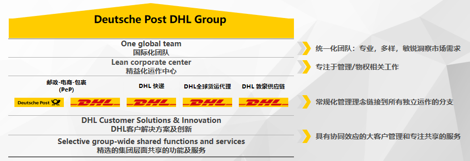 2002年,DHL被德国邮政收购整合。德国邮政作为转型的国企,其并购从战略视角出发,优先发展多层次的普遍物流服务。在融合DHL和德国邮政两大品牌基础上,并购整合其他业务,完成快递、邮政、国际货代、供应链四大业务布局。